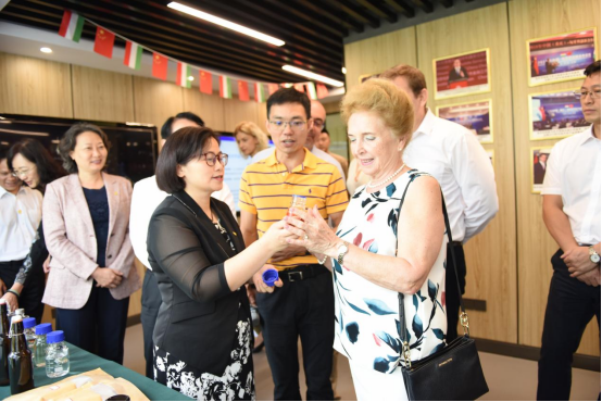 玛特劳伊一行听取了中匈技术转移中心基本情况、工作开展情况、未来展望等方面的工作汇报,并详细了解中心的运营、技术研发、科技成果转化等情况。在中匈技术转移中心服务基地,玛特劳伊一行与入驻机构代表进行交流,并认真了解清咔水果蒸馏酒、发酵蚕蛹等中匈合作研发产品的技术工艺。玛特劳伊说:“希望能进一步加强合作,争取在农业科技方面有更多突破。”
